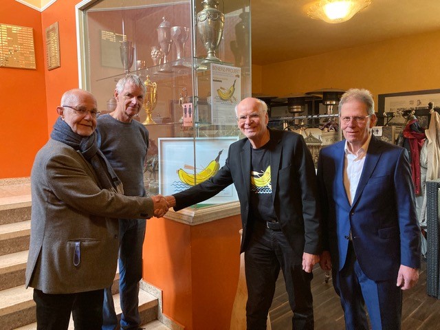 Der Wassersportverein Godesberg (WSVG) wirbt wie alle Bonner Ruder-Clubs für das neue Schülerbootshaus in Bonn. Heute übernahm der Vorstand eine „Ruderbanane“ des bekannten Spray-Künstlers Thomas