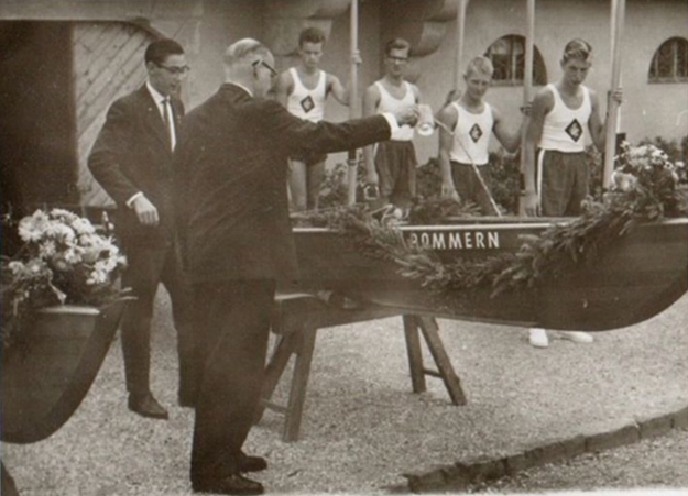 Fritz von Below 1959 bei der Taufe der „Pommern“ als Vorsitzender des SRC (links, im Anzug!) vor dem Bootshaus des ATV Gothia-Suevia, in dem der SRC untergebracht war. Später hatte der SRC ein eigenes Bootshaus in der Gronau, neben dem GRC, das die Stadt Bonn dann mit allen Sportstätten für den Bau des Langen Eugen an den Bund verkauft hat.