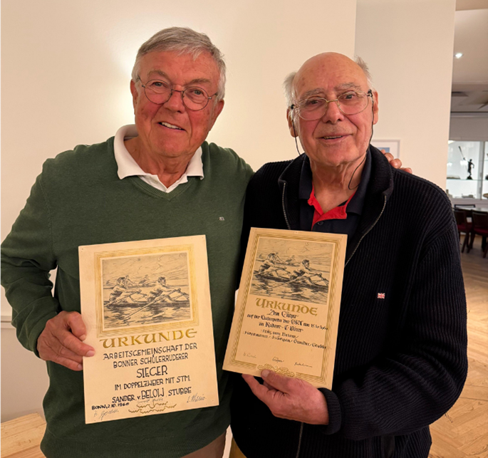 Fritz von Below und Wolfgang Stubbe präsentieren ihre Siegerurkunde im Doppelzweier mit Steuermann von der Regatta der Arbeitsgemeinschaft Bonner Schülerruderer am 2.10.1960 – mit unterschrieben von Fritz Göbels, ehemaliger Protektor des GRC am EMA, Mitgründer des SRC nach seinem Wechsel zum FEG und später Direktor des Tannenbusch-Gymnasiums und Mitgründer des Schüler-Rudervereins dort, der leider nicht mehr existiert